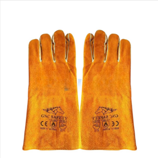 Găng Tay Da Bò Hàn 14-16′, da bò mặt loại A, AB dài 14-16′ tốt nhất, có lót trong, màu vàng tươi, mềm mại, may cẩn thận giúp người công nhân cảm thấy mềm mại và tự tin khi cầm mỏ hàn